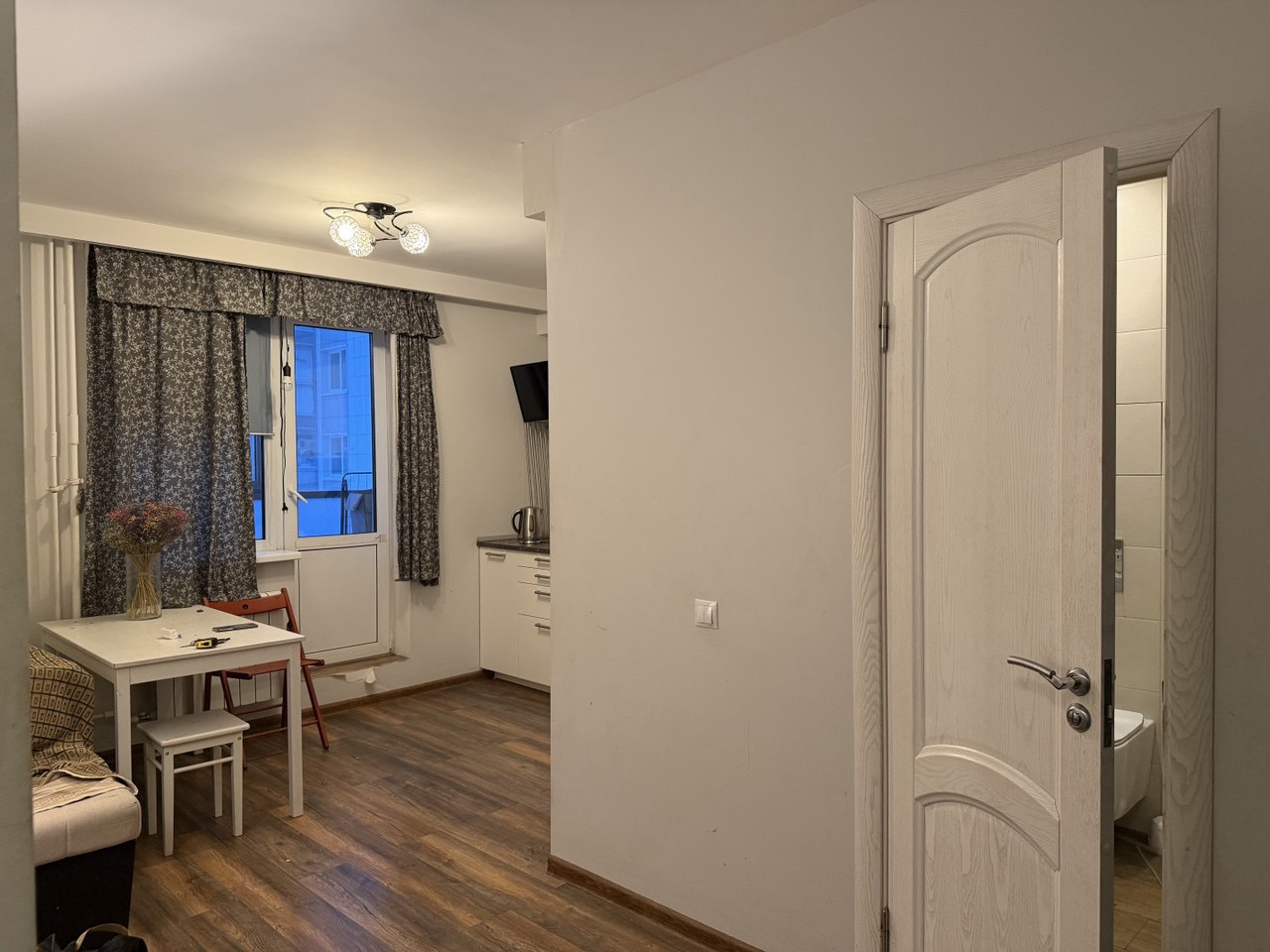 Комната – 17,3 кв.м., кухня – 12,7 кв.м., совмещенный санузел, застекленная лоджия, гардеробная с системой хранения.