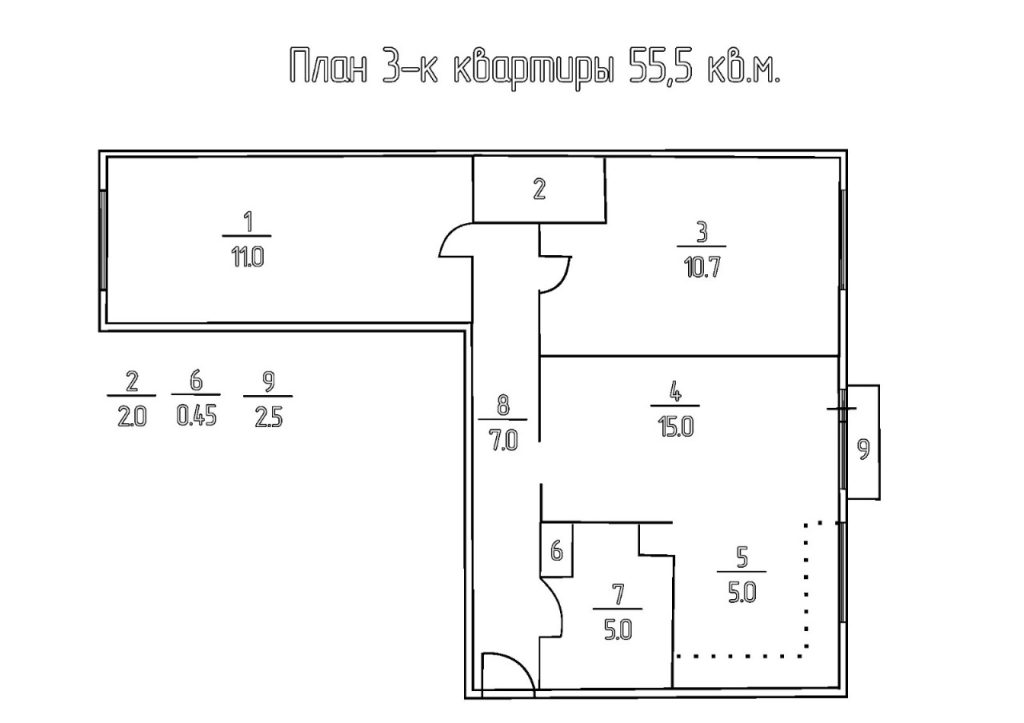 Общая площадь 55,5 кв.м. Изолированные комнаты площадью 11 + 10.7 кв.м. Комната 15 кв.м. совмещена с кухней 5 кв.м.. Совмещенный санузел — 5 кв.м.. Встроенная большая гардеробная 2 кв.м. Застекленный балкон.